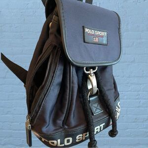 Amazing vintage 90s mini backpack by Ralph Lauren Polo Sport. Navy blue nylon with black rubber and Polo Sport logo. Big silver buckle hardware, exterior side zipper pocket. Rare vintage find! Lined waterproof interior. The drawstrings are a bit pilled but otherwise it’s in great vintage condition!