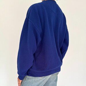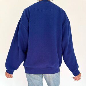 the long sleeved sweater has a bold royal blue body and a crew neckline, and the sweater is ribbed at the neck, cuffs and bottom hem, with a pullover closure. the sweater has a very slouchy and relaxed fit with loose and roomy sleeves, and the fabric is a nice and comfortable cotton blend- perfect to bring to your next roadtrip or cottage weekend!