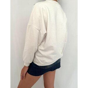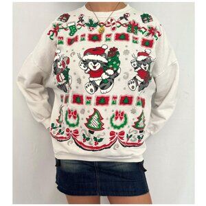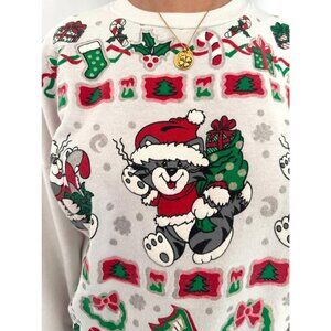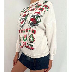 this is a super cute vintage crewneck sweatshirt from the 90s featuring a colorful and sparkly graphic on the front of a festive holiday scene with cartoon kittens and christmas motifs throughout! the graphic has shades of red, green, grey, black, white and silver glitter, and it is also textured, as the white accents are a puffy raised bubble print texture (very common for this decade). the sweater has a white body, bracelet length sleeves (slightly shorter than long length), a pullover closure and is unlined. the shoulder seams of the sweater are dropped for a relaxed and easy fit, and the fabric is a comfortable and nicely worn in cotton blend, making it perfect for cozy and casual wear!