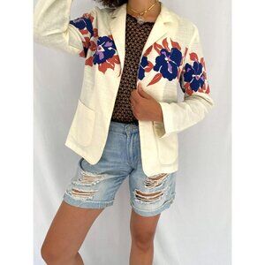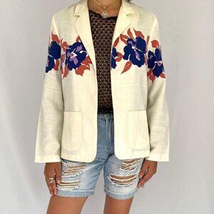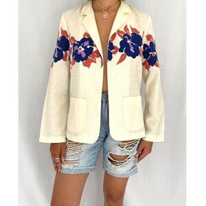 90s vintage cream floral hibiscus print hawaii vacation open front blazer jacket