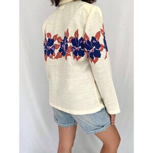this is a unique and artsy lightweight blazer jacket from the 90s with a sophisticated folky resort vibe – perfect for your next yacht club visit or vacation! the cream/natural coloured blazer is collared and features an open front (there is no button closure), long sleeves, and two hip pockets. there is a multicolor Hawaiian hibiscus flower wrap around print in a palette of dark blue, purple and red. the unisex jacket is made of a very light rayon/polyester blend (comparable to a more structured linen) and the jacket is unlined and a bit see-through. the jacket does not have shoulder pads, although there are signs that it once did.