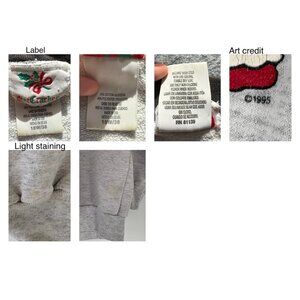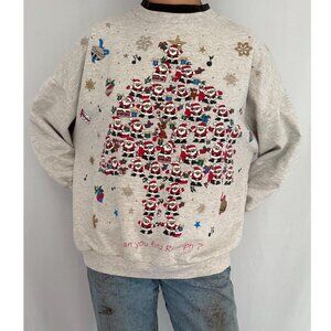 this is an adorable vintage sweatshirt from the 90s featuring a graphic on the front of a many cartoon santa claus’ forming a shape of a Christmas tree, and a puzzle text that reads “can you find Rudolph?” you can spot Rudolph in the middle of the graphic, and there are music notes, snowflakes and other christmas motifs in the background! the holiday sweater features a light grey body with an attached black mock neck double collar, bracelet-length sleeves (a bit shorter than full length long sleeves), and the sweater has a pullover closure and is unlined. the fabric is a warm and comfy cotton blend, making it perfect for cozy and casual wear this holiday season!