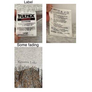 this is a rad unisex vintage t-shirt by Tultex from the late 90s or early 2000s featuring a screen printed graphic on the front of a wolf pack nature scene and a text that reads “kennisis lake” (in ontario, canada). the shirt has a light grey body, a crew neckline, short sleeves, and is made of a sturdy 99% preshrunk cotton. the shirt has a bit of fading (specifically around the text) giving it a cool lived-in look!