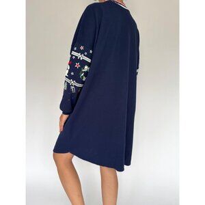 this adorable vintage pajama dress in the 90s is so fun and cozy and would be perfect to wear lounging indoors by the fireplace! the navy blue dress features a high crew neckline that is ribbed in a different fabric with a unique candy cane print, a Christmas themed graphic (with textured puff print!) on the front and on the sleeves, a loose “waist free” waistline, and a midi-length hemline. the fabric feels like a lightweight and fleecey cotton blend, that is unlined.
