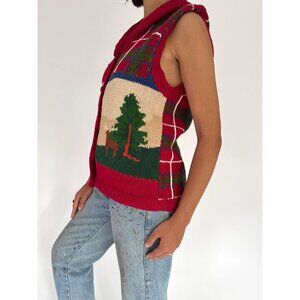 this is a super fun and novelty knit sweater vest by Susan Bristol from 1993 featuring an intricate and colourful outdoor nature hand knitted design with a person on a canoe, a moose, trees, and more! the sleeveless sweater vest has a roll-down collar, a five front button closure with statement brown buttons, and plaid accents on the front and the full backside. the fabric is an unlined cotton/ramie blend (all natural fibres) that is comfortable and medium/thick weight, with no itch.
