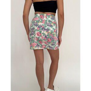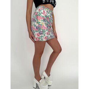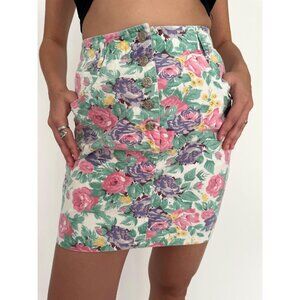 this lovely vintage denim mini skirt by RAZZ from the 90s featuring a floral all-over-print in pastel shades of pink, purple, green and yellow on a white background. the high-waisted skirt features a short mini hemline, a five button-front closure with ornate silver metal buttons, five pockets (three front and two back pockets), and belt loops. the fabric is a lightweight denim (100% cotton) that is unlined, and the skirt has a fitted pencil silhouette.