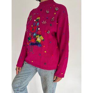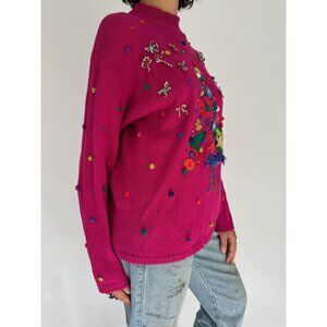 90s vintage pink festive holiday novelty embroidered ugly christmas knit sweater