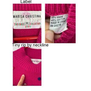 this is a cozy and festive vintage knit sweater from Marisa Christina’s 1999 christmas collection featuring a holiday-themed embroidery on the front in the shape of a Christmas tree – it’s so so cute! the long sleeved sweater features a pink/magenta knit body and it has rainbow pom poms, jewels, and other beading details throughout, and a cable knit design that accents the centre back. the sweater has a high ribbed neckline, a pullover closure, and is made of a comfortable and unlined cotton/ramie blend, that may have a bit of an itch (so please be aware if you have sensitive skin)~