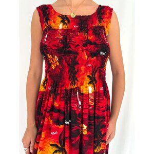 this is an amazing vintage rayon dress presumably from the 90s (based on the tags) featuring a vibrant all-over-print of a tropical scene with palm trees, the ocean and a fiery sunset in shades of red, orange and black. the words “aloha” and “hawaii” can be found throughout the print- it’s truly the perfect piece for vacation! the sleeveless dress features a square neckline, wide straps, a stretchy ribbed bodice, and it goes on with a pullover closure. the silhouette is fitted around the bodice but is flowy just below the bust, and it has a midi/maxi length that hits above the ankle on the 5’6 model. the fabric of the dress is a lightweight, comfortable and unlined 100% rayon, which packs easy without wrinkling and would fit a range of body sizes.