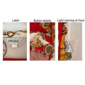 this is a lovely vintage button down blouse from the 80s or early 90s featuring an abstract nautical themed all-over-print in a palette of cream, red, and gold – love the funky baroque vibes! the collared blouse is long sleeved, has no shoulder pads, and it closes at the front with a front button closure with decorative buttons and one button on each of the sleeves. the fabric is untagged, but it feels like a silky semi-sheer polyester that is lightweight and smooth, and is unlined.