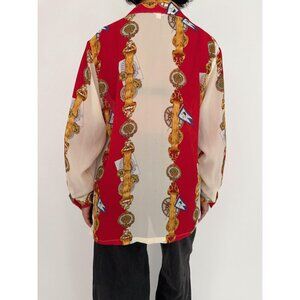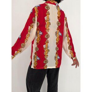 90s vintage red baroque nautical print collared sheer button up blouse shirt