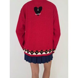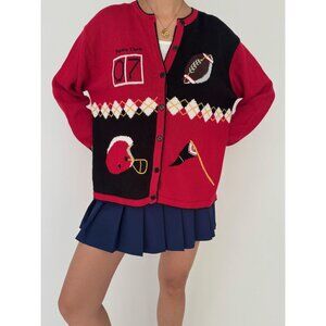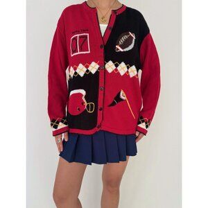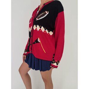 90s vintage red novelty football argyle print embroidered knit cardigan large XL