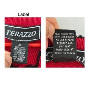 this is a super fun vintage knit cardigan by Terazzo from the 90s featuring a football cheerleading theme – it is so novelty and kitsch! the long sleeved cardigan features a red and black knitted body with white and yellow argyle knitted accents, a crew neckline, and a seven front button closure. there are hand embroidered football-themed designs on the front with sparkly silver threading, and a “I love football” embroidery at the back. the delicate black lettuce trimming around the neckline, sleeve cuffs and bottom hem, is another adorable detail! the fabric is a lightweight and tight knit ramie/cotton blend (all natural fibres), and the sweater has no shoulder pads, and is unlined.