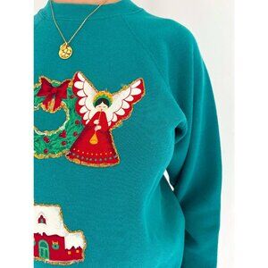 this is a cozy long sleeved vintage crewneck sweater from the 90s that has been reworked by the previous owner with added fabric patches that have holiday motifs and spell out the word “JOY.” the sweater has a very DIY crafty feel to it as the design has been traced by gold glitter paint, making this sweater completely one of a kind! the turquoise sweater features a crew neckline, long raglan sleeves (no shoulder seams), and it is ribbed at the neck, cuffs and bottom hem, with a pullover closure. the fabric is a comfortable and nicely worn in cotton blend, making it perfect for cozy and casual wear!