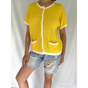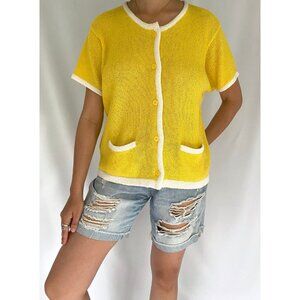 90s vintage yellow knit beach vacation slouchy fun short sleeved button up shirt