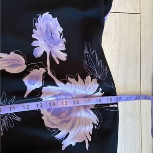 Beautiful vintage dress. Midi length black chiffon dress with large lavender floral print. Lined, pull on style. This dress can be dressed up for a wedding or dressed down with a jean jacket for date night. Size 16, true to size.
