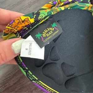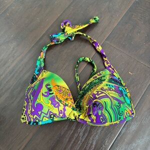 Bright and colorful bikini top with a unique pattern. Features shades of green, yellow, and purple.