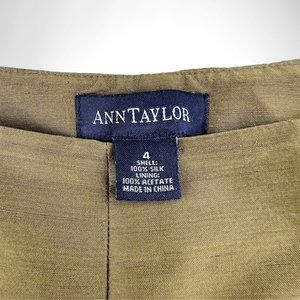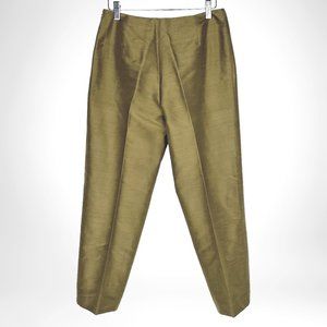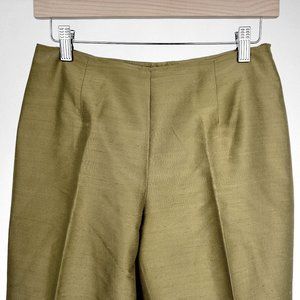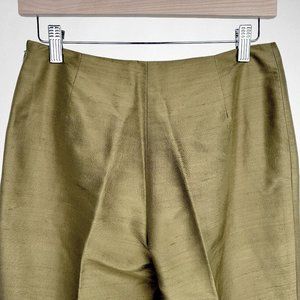 Vintage Ann Taylor mid-rise cropped dress pants in structured olive green silk shantung, featuring a straight creased leg and an invisible zipper closure at the left side seam.