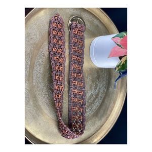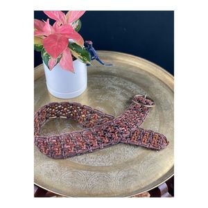 No size, brand or fabric tags. Well made. Heavy smooth brass belt buckle. Detailed leather and twine braided strap. No damage noted. Pet and smoke free studio.