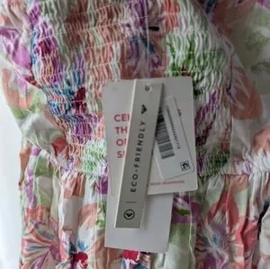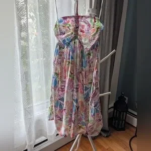 Colorful strapless dress with a vibrant floral pattern. Perfect for summer outings.