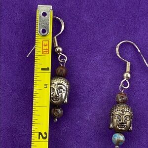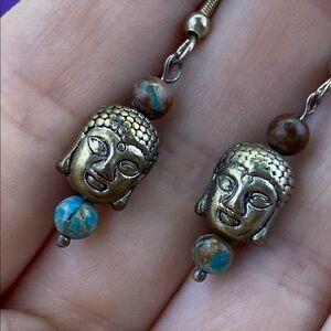 Elegant Buddha head dangle earrings featuring gold and blue tones. Perfect for adding a touch of spirituality and style to any outfit. The Buddha head represents wisdom, enlightenment, and the path to Nirvana.