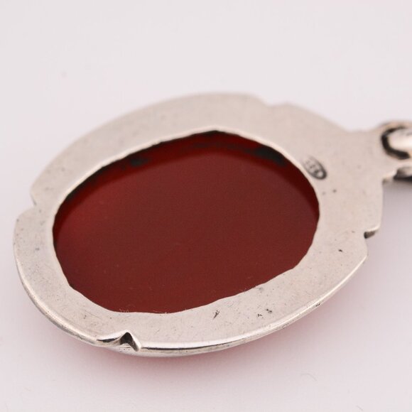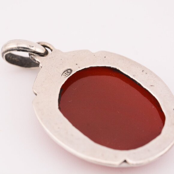 This pendant features a gorgeous orangey brown Carnelian framed in a sturdy sterling silver setting. This piece looks to be a handmade vs mass produced piece. You can that in the details of the piece. Made with a large bail to accommodate all chain sizes. Because this is a handmade pendant there are imperfections we would consider manufacturers defect.