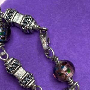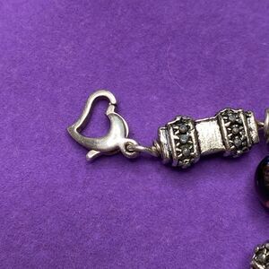 Beautiful purple Murano glass beads with sterling silver detailing. Has a cute heart clasp that secures the bracelet.