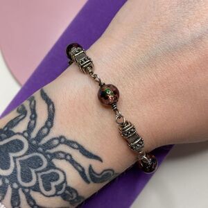 Beautiful purple Murano glass beads with sterling silver detailing. Has a cute heart clasp that secures the bracelet.