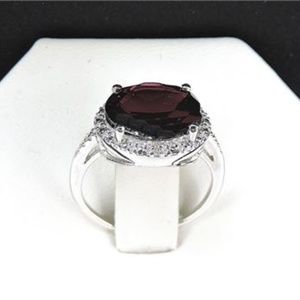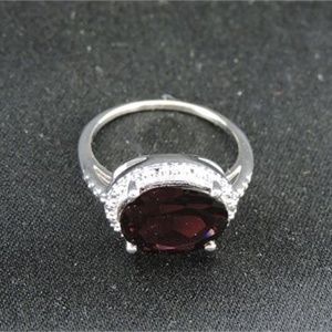 A deep red, oval-cut garnet gemstone takes the spotlight as it sits on the center of a 925 silver ring band and is further enhanced by small round cut diamonds. Bold and captivating, this ring will surely become a remarkable finishing touch to any look!