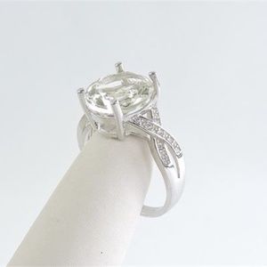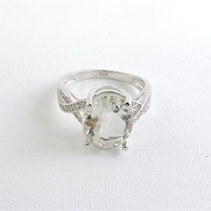 Bold and dramatic, this ring showcases a beautiful large green amethyst surrounded with a vibrant display of CZ stones. Bright and captivating, this ring will surely catch the attention of many!