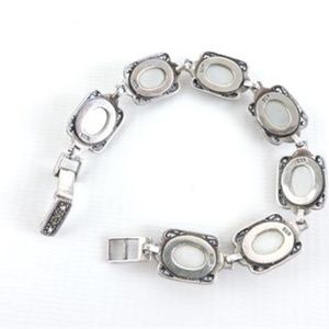 A classic piece sure to be cherished for the years . This bracelet features seven oval cabochon mother of pearls in 925 silver link setting. Eye catching luster. Simple yet timeless, this bracelet will definitely be your fav!