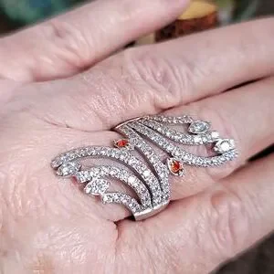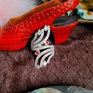 925 and clear stone (cz?) statement ring with 2 red stones added to replace missing stones can easily be removed and clear stones put in. Price will reflect this. Large ring size 11 great for the pointer finger.