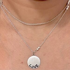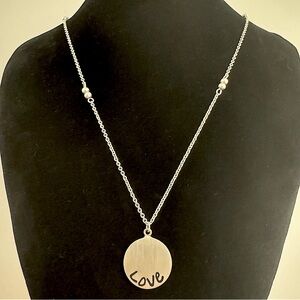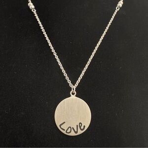 Stamped ATI 925 Mexico on the back of the pendant. Vintage pendant stamped 925 sterling silver LOVE circle coin pendant on a vintage silver tone necklace. The chain necklace is not sterling silver. Pendant is local Mexican artisan-made. Both the necklace and pendant are in excellent vintage condition. Chain is long and has a clasp—can be worn long or layered (doubled) due to the clasp. Wear the pendant on chain of your choice—happy to sell just the pendant upon buyer request.