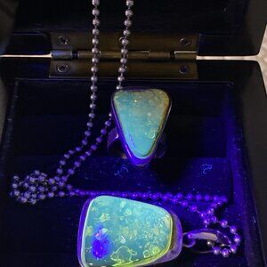 The amber stones show natural inclusions and exhibit a strong green-blue fluorescence under UV light, consistent with genuine Baltic amber.