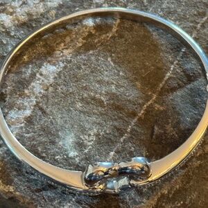 This is a stunning and elegant hinged bangle bracelet crafted from bright, polished .925 Sterling Silver. The bracelet features a prominent interlocking heart clasp at the center, symbolizing love and connection.