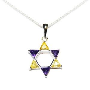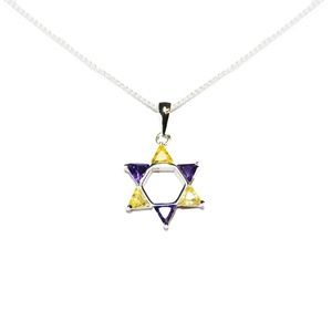 925 sterling silver star pendant featuring purple and yellow cubic zirconia (CZ) on a 925 sterling silver chain with standard clasp closure. The chain is very fine and thin.