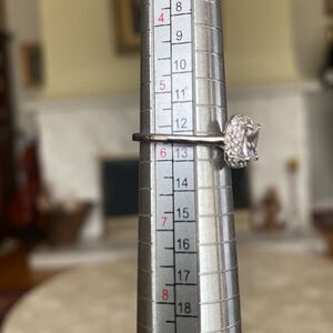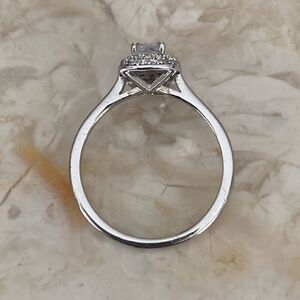 In excellent preowned condition lovely sterling silver and cubic zirconia engagement style ring. Centre stone is emerald cut and it’s surrounded two tiers of tiny cubic zirconias.