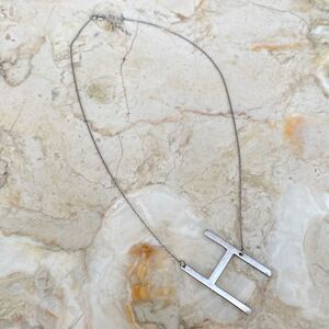 In excellent preowned condition large asymmetrical sideways initial “H” necklace in 925 sterling silver.