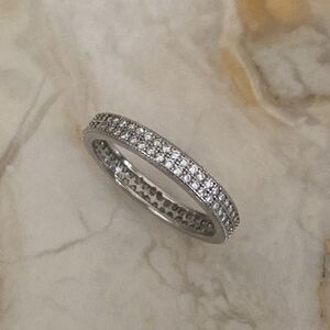 Hardly worn and in excellent condition beautiful sterling silver eternity ring featuring double row of sparkling cubic zirconia stones.
