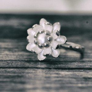 Gorgeous genuine freshwater pearl ring embedded in pure white lotus flower petals. It’s simply a genius idea to combine the delicacy of authentic pearl with the elegance of the lotus flower in one piece.