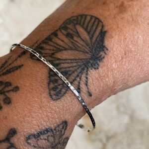 In excellent preowned condition lovely sterling silver bangle bracelet with an engraved date. Handcrafted with a hammered finish, this skinny bangle is the perfect stacking bracelet.