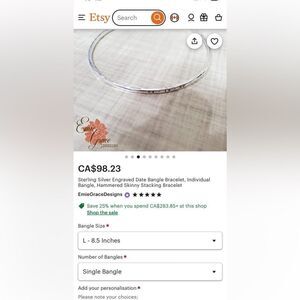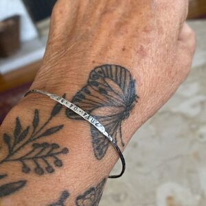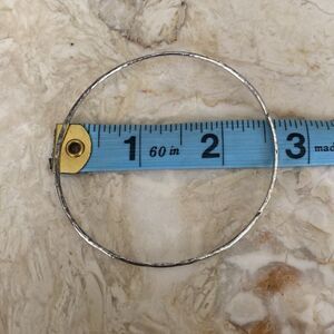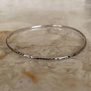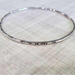 In excellent preowned condition lovely sterling silver bangle bracelet with an engraved date. Handcrafted with a hammered finish, this skinny bangle is the perfect stacking bracelet.