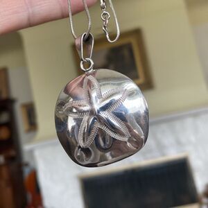Beautiful sterling silver pendant, large and solid, concave design with an engraved starfish. The pendant hangs from a pretty 24” long sterling silver snake chain.