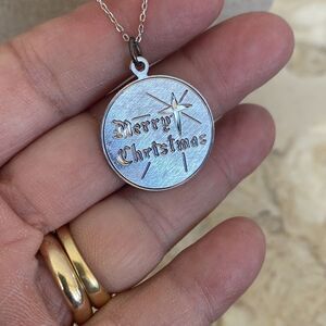Sweet sterling silver necklace featuring a round medallion pendant engraved Merry Christmas, reverse side could be customized. The pendant hangs from a dainty 20” sterling silver chain.