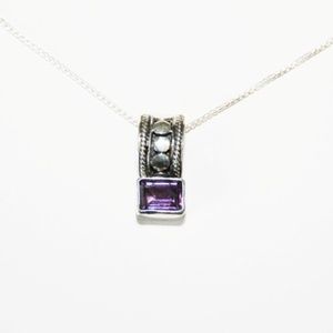925 sterling silver pendant featuring a purple cubic zirconia (CZ) on a 925 sterling silver chain with standard clasp closure. The chain is very fine and thin.
