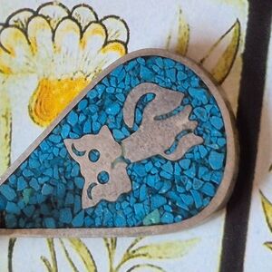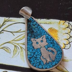 925 sterling Unique teardrop pendant featuring a cat design with vibrant blue turquoise inlay. signed on the back