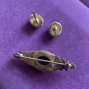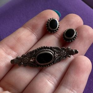 Gorgeous onyx earring and brooch set. Very gothic. Has some tarnish but can be polished upon request.