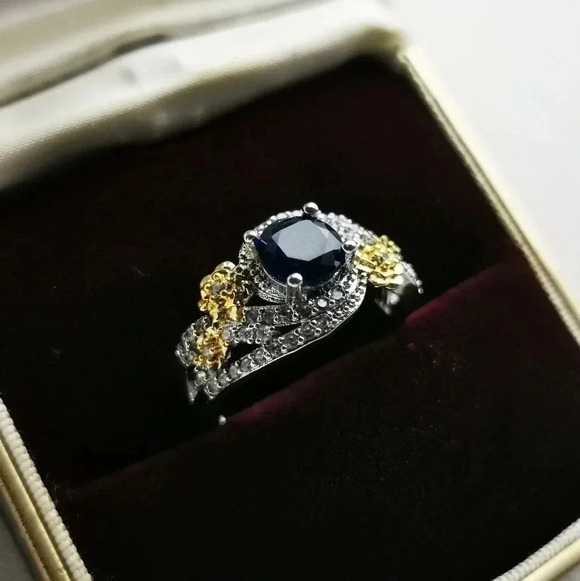 Vibrant blue stone with clear stones and yellow flower accents. Approximately size 9
