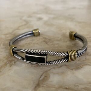 In excellent preowned condition attractive sterling silver cuff style bracelet featuring a fancy twist design, brass wrappings and a rectangular centre made of black enamel.