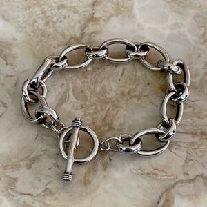 In excellent preowned condition beautiful sterling silver chunky oval link bracelet with elegant toggle closure.